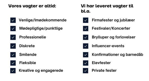 Når I booker vagter hos os, kan I være helt trygge – vi har over otte års erfaring og leverer vagter til mere end 500 begivenheder om året. Vi ved præcis, hvad der skal til for at skabe en sikker og tryg fest, hvor alt spiller fra start til slut.